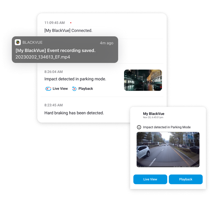 Neka vaša BlackVue nadgleda vaš automobil i upozori vas na incidente. Kada detektuje sudar, BlackVue će vam poslati obaveštenje na vaš telefon ili web pregledač, zajedno sa snimkom događaja.
